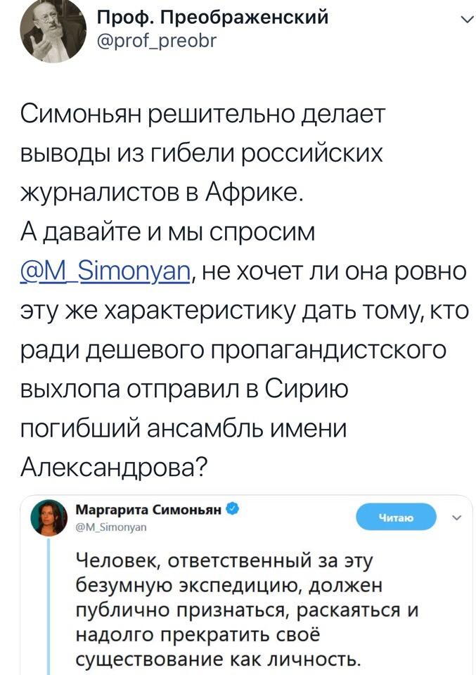 Но тем, кто очень волнительно переживал первые поступающие данные о гибели российских журналистов и опешил от подтверждения убийства эти инсинуации «богомола-уе..на» (так окрестили Ходорковского в сети) – как плевок в душу: уже сейчас Международная федерация журналистов выступила с требованием к властям ЦАР найти и привлечь к ответственности виновных в убийстве военных корреспондентов. Друзья и коллеги добьются справедливого наказания, тогда как Ходорковский вновь трусливо спрячет голову в песок и навсегда забудет имена тех, кто погиб за его «шкурные» интересы.