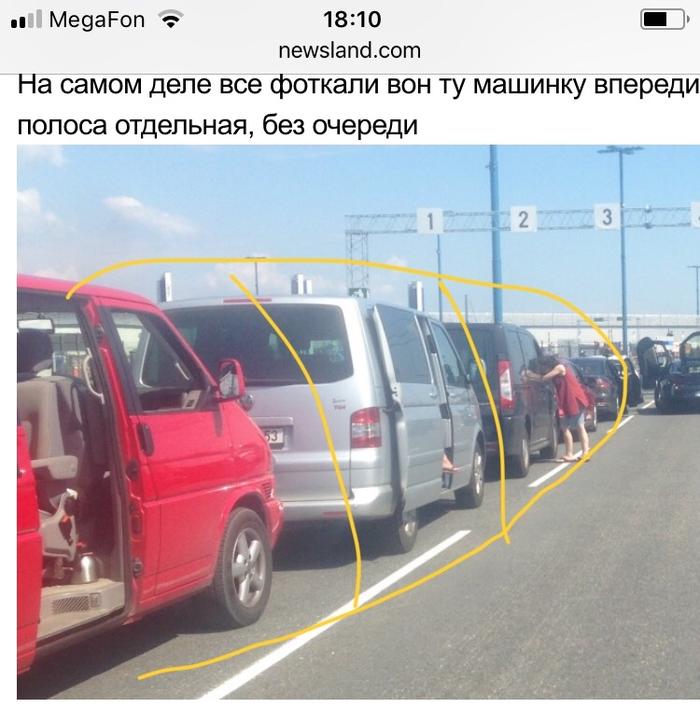 На самом деле все фоткали вон ту машинку впереди, с "крыльями". Видимо, вип какая-то - вон, даже полоса отдельная, без очереди