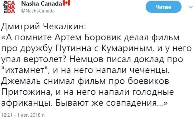 - Новая версия расходится со свидетельством выжившего водителя российских журналистов. Он говорил, что россияне попали в засаду и погибли на месте. Источники в полиции ЦАР заявляли «Интерфаксу», что, по их версии, нападение было совершено с целью грабежа. У журналистов было с собой $8,5 тысяч наличными и дорогие камеры.