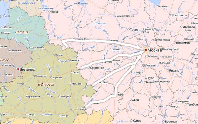 Третий маршрут: Гомель ― Клинцы ― Брянск ― Малоярославец ― Москва. Его длина тоже около 580 километров.
