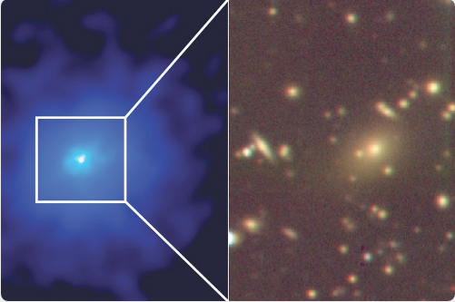Слева: снимок PKS 1353−341 телескопа «Чандра», на котором виден яркий центральный источник и окружающее его рассеянное излучение кластера. Справа: снимок Magellan PISCO внутренней части галактического кластера, на котором видна гигантская эллиптическая галактика в самом центре / MIT.