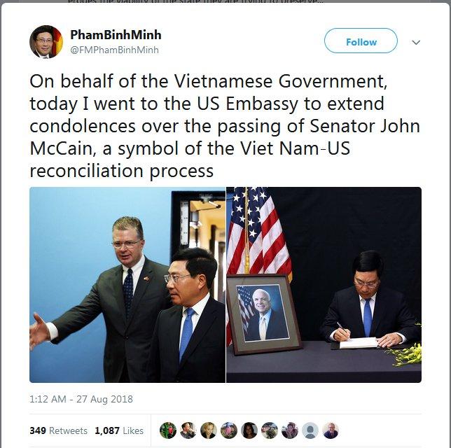 Вьетнамское правительства выразило соболезнование с связи с кончиной сенатора Маккейна "символа вьетнамско-американского примирения". Теперь единственными "вояками" призывающими к справедливости в Вьетнамской войне 50-летней давности будут кремлевские тролли.