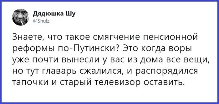 Ещё пока только "не ящики таскают" на тему пенсионного возраста и пенсионной реформы, а уже потребовалось "самое серьёзное оружие" … Мало того, если эту реформу протолкнут, то в результате ещё больше потеряют на серых з.п. и самозанятых … а возможностей для манёвров у власти не останется, так как пенсионеров будет уже не обобрать, кроме как отменить пенсии вообще (военным не получится, а остальным уже будет по одному месту). Демография и деловая активность пойдут по другому месту.