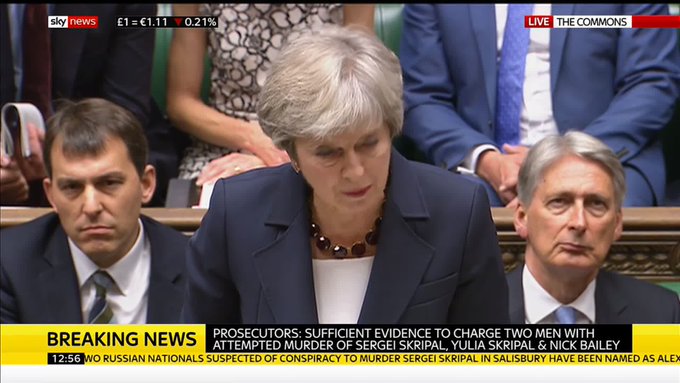 Sky News✔@SkyNewsTheresa May says the men identified as suspects in the Salisbury poisonings are members of Russia's military intelligence service (the GRU) and says the poisonings were "almost certainly also approved outside the GRU at a senior level of the Russian state"