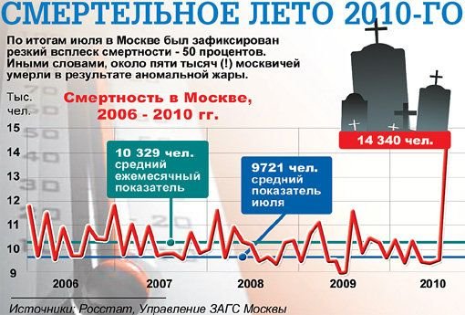 Согласно статистике, из-за аномального лета смертность по сравнению с летом 2009 года только в Москве выросла на 52 процента. Уже понятно, что эти потери - не последние. Медики прогнозируют в ближайшее время резкий рост заболеваемости и смертности. По примерным прогнозам, в течение пяти лет увеличатся: