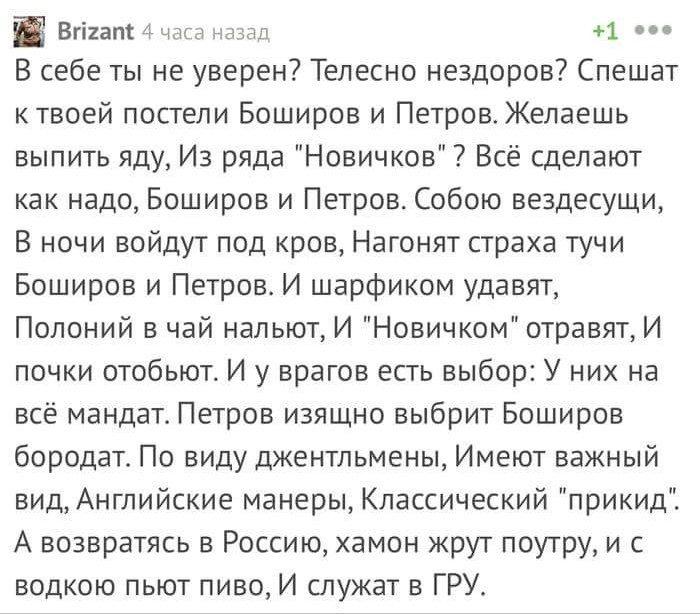Другой вопрос: почему "Боширов" и Петров" все время были вместе, друг с другом и ни разу не расставались, ночевали в одном номере? Не потому, что они геи, никакие они не геи. На это тоже есть несколько предположений: страховали друг друга от непредвиденных обстоятельств, в том числе от неожиданных похищений,исчезновений.
