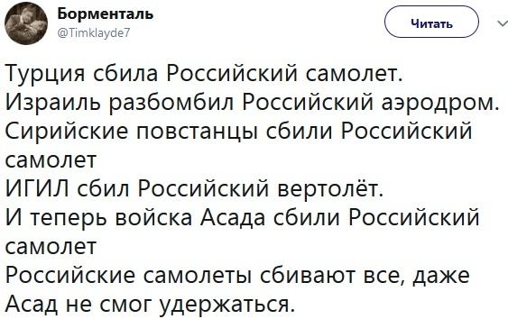 Первое — банальное головотяпство сирийских военных, которые сбили российский самолет, приняв его за самолет противника (здесь намекают на то, что его спутали с израильским самолетом).