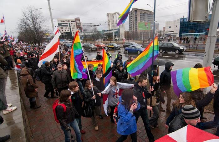 На фото под бело-красно-белыми флагами демонстрация политических активистов из числа белорусских националистов,