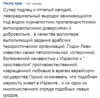 И я уверен, что этого поца Гидона Леви не посадят "за репост", не будут мурыжить судами за "оскорбление чуйств", не обвинят в похищении финиковой пальмовой рощи, не "вызовут на дуэль" и не застрелят у стен Кнессета, как это принято в России :))