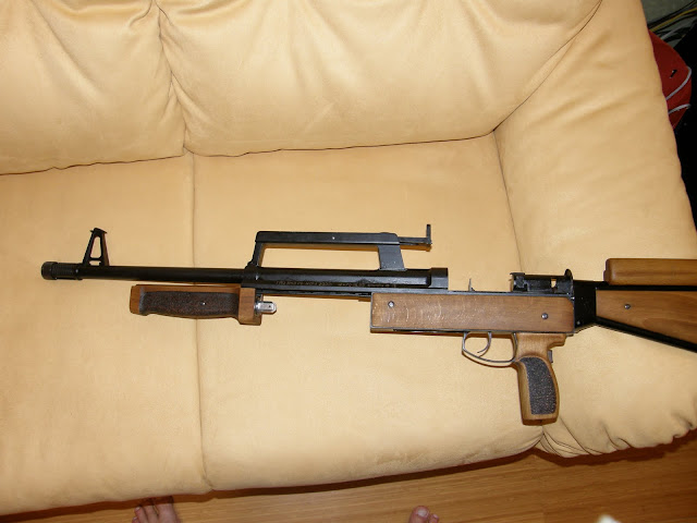 Совместными усилиями разобрались как правильно присоединять магазин и защелкивать приклад )))) Так-же получил чувствительный удар в скулу этой чудовищно неудобной деревянной щекой, причем не от выстрела, а от простой вскидки )))))))) Но какое же оно легкое и компактное! Насечки на рукоятке и цевье сделаны видимо выжигательным аппаратом, а спуск такой же длинный как на Васпе.