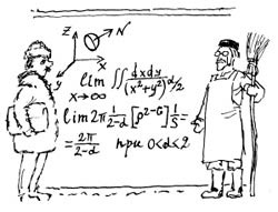 С преподаванием физики дела обстоят похоже, только рассказывать про это скучно - здесь не так много смешного. Потому очень кратко (просто для полноты картины): курс физики в первом семестре в Университете имени Пьера и Марии Кюри начинается почему-то с линейной оптики (при этом параллельно на лабораторных занятиях студенты зачем-то изучают осциллограф), затем - два занятия подряд они зубрят наизусть огромную таблицу с размерностями физических величин (то есть как выражается в килограммах, секундах и метрах, скажем, гравитационная постоянная и т. п.; замечу попутно - при этом они понятия не имеют, что такое гравитационная постоянная), затем - механика (столкновения шариков, равновесие сил и т. п.), и наконец венчает осенний семестр почему-то гидродинамика. Почему именно такая выборка - понятия не имею, возможно, это то немногое, что знает главный координатор (и лектор) нашей секции. Почему именно в таком порядке? Да, собственно, какая разница, в каком порядке все это зубрить...