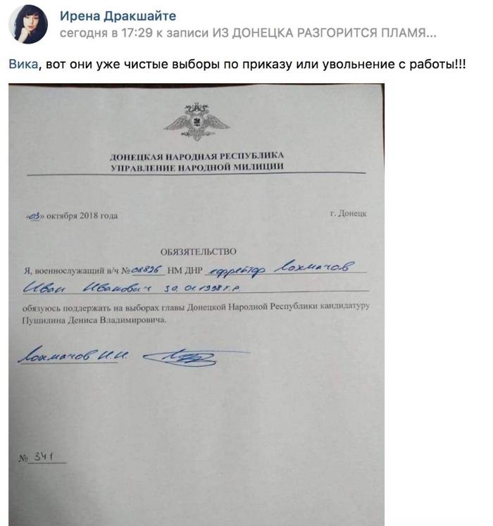 Управление "народной милиции ДНР" методом шантажа вынуждает боевиков подтверждать то, что они непременно проголосуют за любимчика Кремля. Террористы должны подписать обязательство отдать свой голос за Пушилина или "вылетают" с треском с работы.