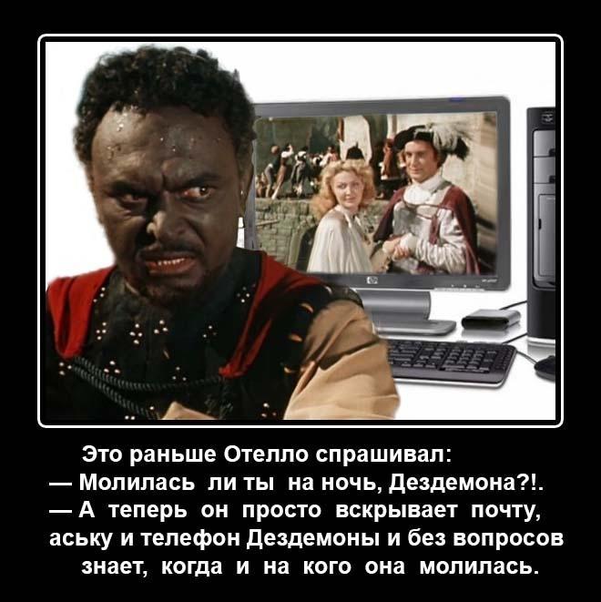 Приходит Отелло в чертоги, весь взволнованный, с мыслью возлечь со своей обожаемой супругой (целый день летал в ступе, завелся страшно), а Дездемона (вообразите, даже и не спросила, молился ли он на ночь!) – кинулась и удавила. Одной левой. В состоянии аффекта.