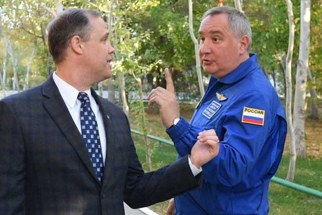 Генеральный директор ГК «Роскосмос» Дмитрий Рогозин и глава NASA Джим Брайденстайн во время встречи на космодроме «Байконур» перед стартом экипажа МКС-57/58. Фото: Алексей Филиппов / РИА Новости