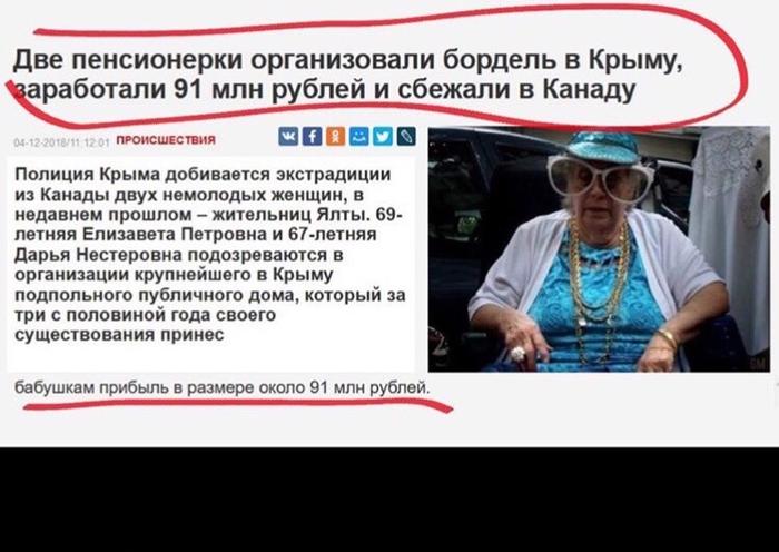 Это получаецо в крыму полно мужигоф с деньгаме и потенцией, а фсе деньги мимо нашей кассы? У каких то бабуль? Это значит бабули смогли в бардельчике 91 лям насосать? А вы с Золушкой почему кассу не пополнили? Почему бордель не открыли?