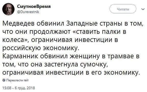 Злые языки даже утверждают , что и тому Путину подосрал со своим тяжёлым наследством какой-то президент Путин разлива 2004-ого года , да и тому оно свалилось , вы не поверите , от Путина образца 2000.