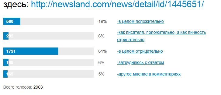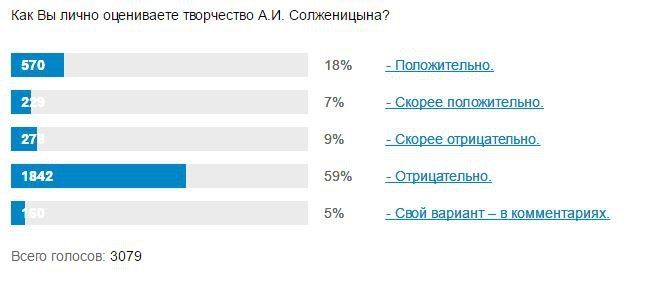 Что касается опросов. Макспарк- это выборка людей. И по меркам социологии, почти 3000 человек- это очень большая выборка. На макспарке много либералов, очень много. Все либералы ЗА солженицына. И тем не менее... Если найдется еще опрос, я вам сообщу. Но уверяю вас, результат будет таким же.