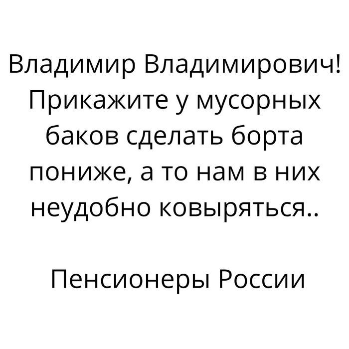 Спасибо, что подняли с колен пенсионный возраст! Мы, Владимир Владимирович, худеем с ваших реформ! Вы там, часом,...