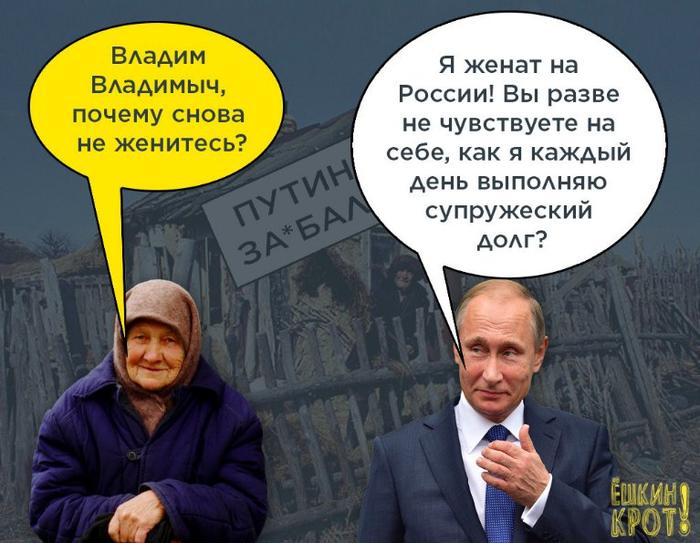 "Читаю газету — там Путин, включаю телевизор — там Путин, слушаю радиоприёмник — там Путин, открываю новости в Интернете — там Путин. Я уже боюсь порнографию включать!"