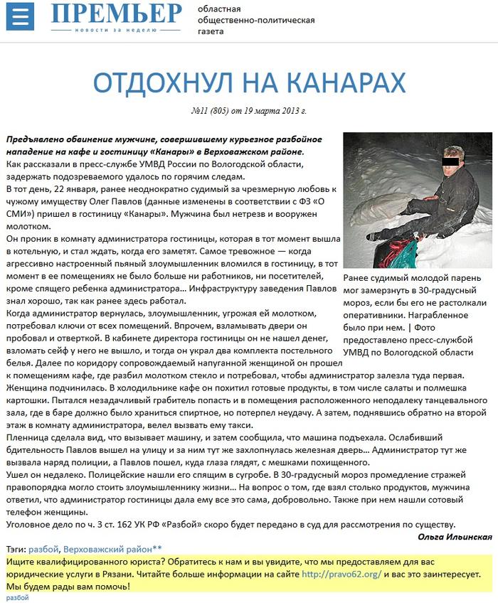 Мы нашли его примерно в двухстах метрах от места преступления. Парень спал в сугробе на обочине дороги пьяный в 30 градусный мороз. В руках он держал пакеты и мешок с похищенными продуктами. При досмотре нашли и похищенный мобильный. Он был сильно удивлен, когда нас увидел», - рассказывает старший следователь следственного отделения МО МВД России «Верховажский» Михаил Юрин.