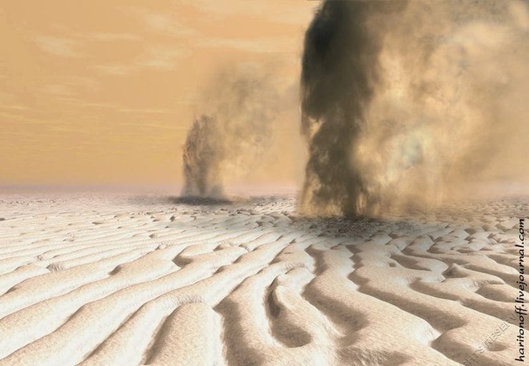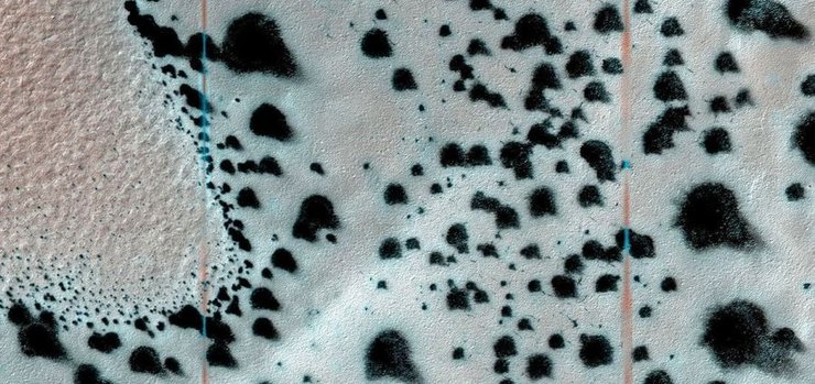 Весной солнечные лучи нагревают марсианский лед диоксида углерода под слоем песка и пыли, в результате чего углекислый лед превращается в газ и извергается на марсианской поверхности в виде гейзера из газа, пыли и песка высотой 100-200 метров. Кроме того можно предположить, что часть углекислого газа распадается на молекулярный кислород и атомарный углерод под действием высокоэнергетического ультрафиолетового излучения - при этом кислород улетучивается, а углерод в виде пыли оседает в диаметре нескольких сот метров вокруг гейзера.