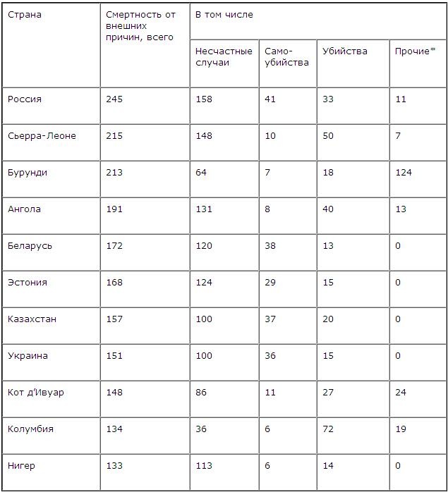 Таблица 1. Смертность от внешних причин в расчете на 100 000 жителей в 2002 году, страны-рекордсмены: