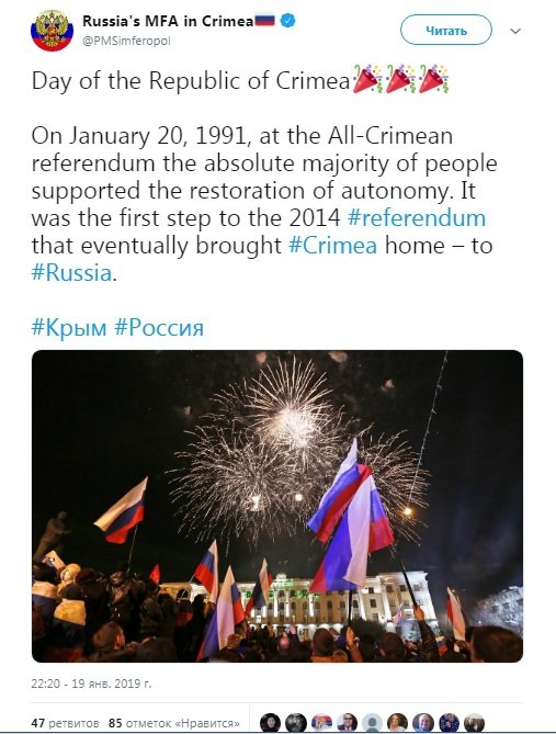 В Киеве убеждены, что предоставлением крымскому представительству МИД РФ Twitter признает полуостров Крым российским....
