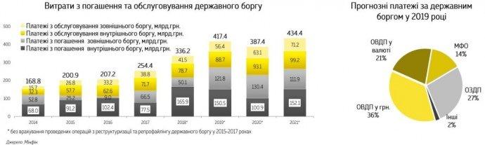 Министерство финансов оценивает общий объем платежей по государственному долгу в 2019 году в 417 миллиардов гривен, или 14,2 миллиарда долларов.