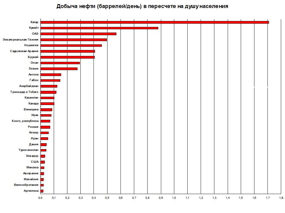 Количество добываемой нефти на душу населения по странам мира - информация общедоступная. "Богатейшая" Россия замыкает второй десяток (добыча на душу населения раз в пять меньше, чем в Норвегии и в полтора раза меньше, чем в Канаде). А по экспорту у России разница с Норвегией вообще в 14 раз.