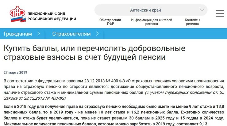Россиянам, не заработавшим право на получение трудовой пенсии по старости, необходимо перечислить в Пенсионный фонд дополнительные средства, сообщает пресс-служба ПФР. В 2019 году, чтобы получать от государства выплаты после наступления пенсионного возраста, нужно иметь как минимум 10 лет стажа и 16,2 пенсионных балла. В ближайшие годы планка «отсечки» будет резко повышена - до 30 баллов (к 2030 году) и 15 лет (к 2024 году). Если хотя бы одно условие не соблюдается, права на пенсию по старости нет. То есть даже мужчине пенсионного возраста, который последние пять лет работал на должности с хорошей зарплатой и накопил баллы, не дадут пенсию, если у него только 7 лет официального трудового стажа. Тем, кто не вписывается в новые критерии, можно докупить пенсионные баллы, самостоятельно перечислив добровольные страховые взносы в счет будущей пенсии, отмечает ПФР.
