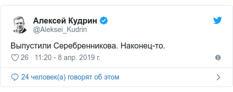 Рукопожатные круги вне себя от ликования. "О его (Серебренникова - Прим.) невиновности полтора года говорили во всём мире!" - кричит Lenta.ru. "Восьмое апреля неожиданно стало счастливым днём", - пишет сайт Михаила Ходорковского. "Выпустили Серебренникова. Наконец-то", - торжествует руководитель Счётной палаты РФ Алексей Кудрин, давний фанат специфического творчества режиссёра. "Кирилл!!!! Ураааааа!!!!", - истошно вопит Ксения Собчак в своём Telegram-канале "Кровавая барыня". Советник президента по культуре Владимир Толстой назвал решение суда "замечательной новостью", глава президентского совета по правам человека Михаил Федотов - "абсолютно правильным решением".