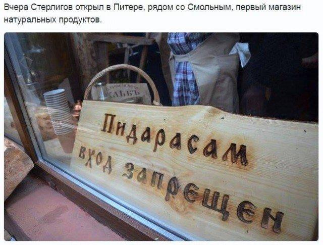 - Магазины так называемого православного предпринимателя Германа Стерлигова "Хлеб и соль" в 2017 году открылись в Кирове, Перми и Санкт-Петербурге. Однако в июне после многочисленных жалоб горожан из-за гомофобной вывески магазин на Лиговском проспекте в Петербурге был закрыт. Сам Стерлигов объяснил это неудачной локацией.