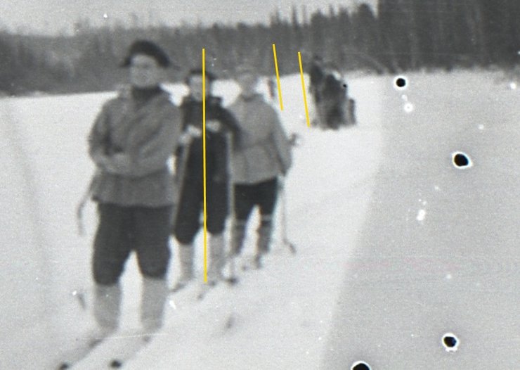 Чувствуя огрех, мастер сдвинул фото по оси. А если мы выровняем его по деревьям, то увидим, что Дубинина сравняется с Дятловым ростом (у них разница 8 см - пол-лица), а палки Дубининой станут длинней дятловских. Отрезки равны, левый - от края ручки до кольца палки Дубининой.