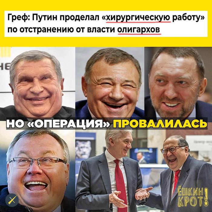Путин и его команда после прихода к власти в 2000-х проделали «хирургическую работу» по удалению олигархов из власти, заявил Греф. И даже ни разу не покраснел: https://t.me/eshkinkrot/1272