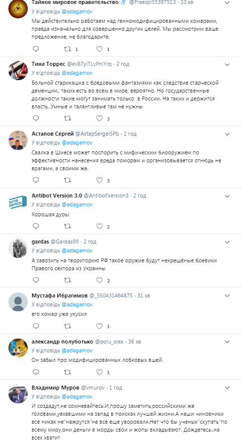 По его мнению Америка не выполняют Конвенцию о запрещении бактериологического оружия, подписанную в 1972 году. И американцы якобы травят "скрепную" державу вирусами, используя... клещей и генно-модифицированных комаров.