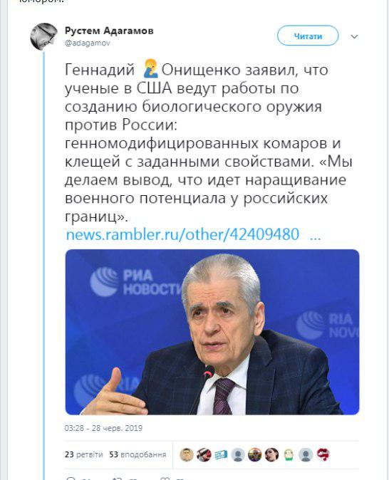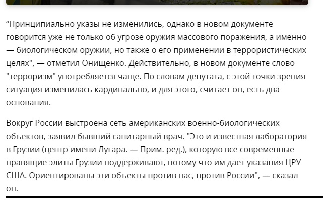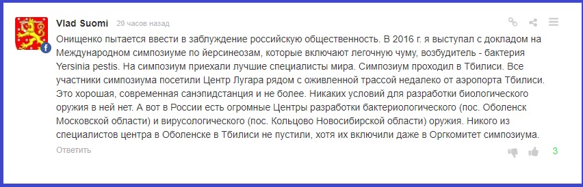 "Онищенко пытается ввести в заблуждение российскую общественность. В 2016 г. я выступал с докладом на Международном симпозиуме по йерсинеозам, которые включают легочную чуму, возбудитель - бактерия Yersinia pestis. На симпозиум приехали лучшие специалисты мира. Симпозиум проходил в Тбилиси. Все участники симпозиума посетили Центр "Лугара" рядом с оживленной трассой недалеко от аэропорта Тбилиси. Это хорошая, современная санэпидстанция и не более. Никаких условий для разработки биологического оружия в ней нет. А вот в России есть огромные Центры разработки бактериологического (пос. Оболенск Московской области) и вирусологического (пос. Кольцово Новосибирской области) оружия. Никого из специалистов центра в Оболенске в Тбилиси не пустили, хотя их включили даже в Оргкомитет симпозиума", - пишет Vlad Suomi.