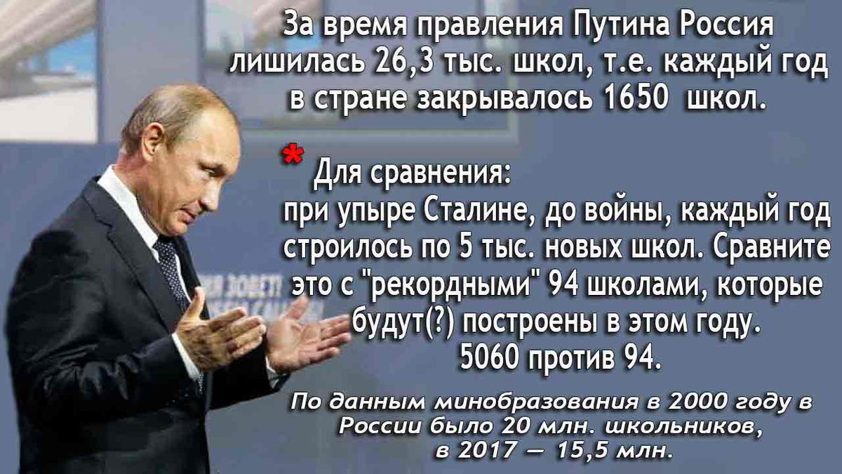 Россия стремительно катится вниз, а население с каждым годом живет все хуже. Кроме того, если посмотреть на статистику с 2000 года, то число социально-значимых объектов сокращается, и страдает от этого прежде всего простой народ. Но при этом нам говорят, что Владимир Путин, который пересидел на своем месте даже Брежнева успешно вывел страну из тяжелых 90-х, «поднял Россию с колен», и в целом принес в страну много хорошего.