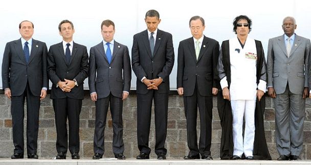 Каддафи с членами Большой восьмерки в Аквиле (Италия) 2009 г.