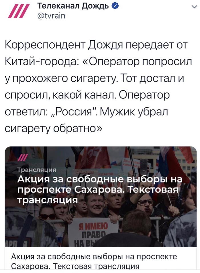 Журналист издевательски спрашивает молодого человека, которого ведет под руку сотрудник полиции: «Вы не особо-то сопротивляетесь, раз Вас один сотрудник ведёт за руку?». Молодой человек на секунду впадает в ступор от этого вопроса, затем резко пытается вырваться и получает закономерный итог – ему заламывают руки и ведут дальше. Вуаля, корреспондент «Дождя» достиг своей цели: кадр о «зверстве и жестокости» российской полиции получен.