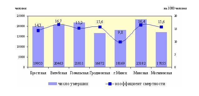 Число умерших и коэффициент смертности по областям и г.Минску за 2010 год, по данным Белстата.