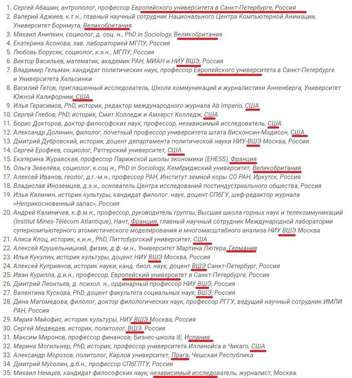 Хорош и весь список. Львиная доля подписантов постоянно проживает за границей (США, Великобритания, Франция, Германия и др.). А российскую часть списка представляют, главным образом, сотрудники Высшей школы экономики и Европейского университета в Санкт-Петербурге. Сплошь грантоеды-соросята.