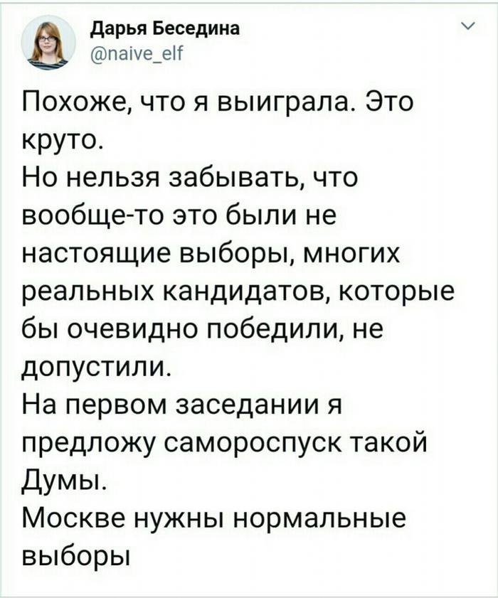 Информация, доступная на момент публикации, показывает, что представители КПРФ лидируют в 12 округах, СР — в четырех, «Яблока» — в трех. Глава Общественного штаба по наблюдению за выборами в Москве Алексей Венедиктов предположил в своем телеграм-канале, что «Единая Россия», вероятно, получит 22 места в городском парламенте, КПРФ — 12, «Яблоко» — четыре, «Справедливая Россия» — два.