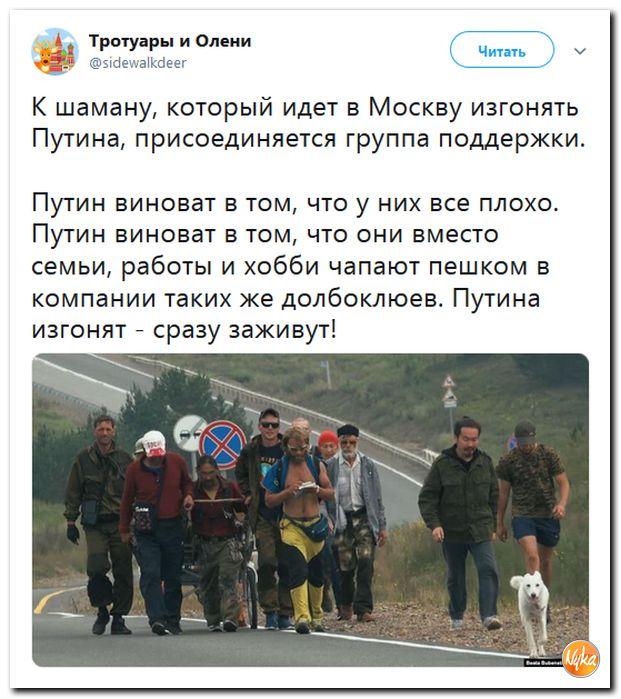 Поначалу известие о том, что некий шаман идет пешком из Якутии в Москву «изгонять Путина», вызывало разве что усмешку. Мало ли в России сумасшедших да калик перехожих? Катит себе по дороге человек тележку со скарбом, рядом с ним бежит собака. Кому это интересно? Но человек, называющий себя шаманом, все шел, и вокруг него стали происходить примечательные события. У него стали появляться спутники и сторонники. На границе с Бурятией ему пытались преградить путь местные шаманы из общества «Тэнгэри». В районе Улан-Удэ к делу подключились государственные структуры. Сотрудники полиции отняли у шамана два обозных автомобиля, на котором везли вещи путников, задержали его сторонника. После этого в Улан-Удэ начался уличный протест, в ходе которого «Единую Россию» обвиняли в узурпации власти, а Москву — в сдаче Дальнего Востока китайцам.