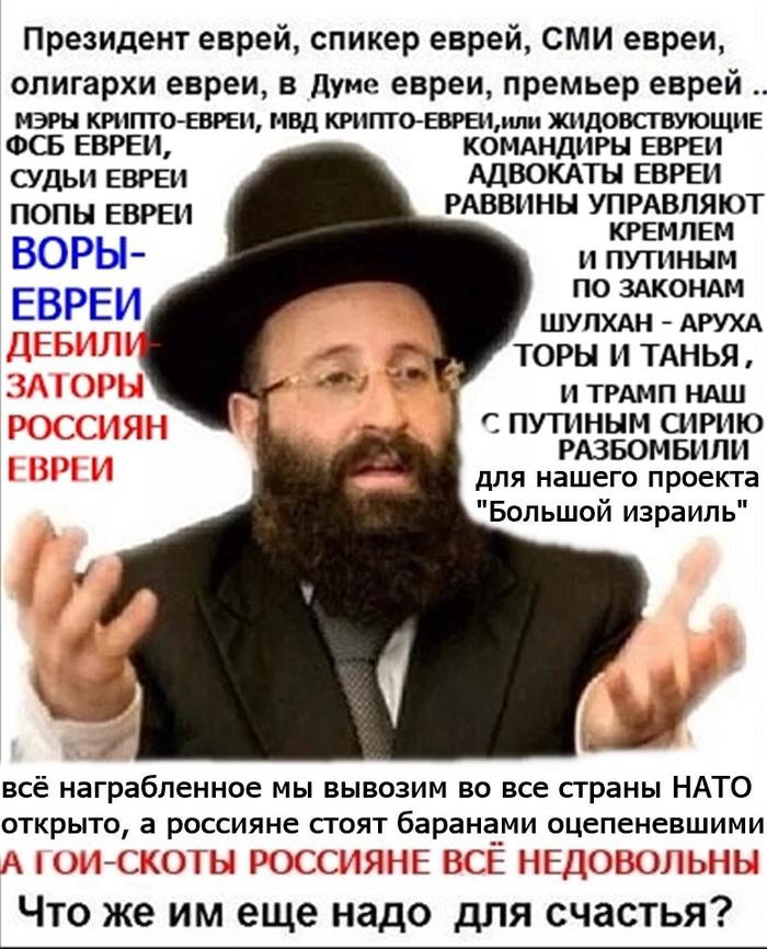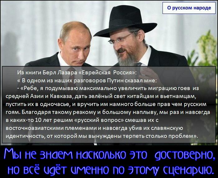 В одном из наших разговоров Путин сказал мне:- Ребе, я подумываю максимально увеличить миграцию гоев из Средней Азии и Кавказа, дать зеленый свет китайцам и вьетнамцам. пустить их в одночасье и вручить им больше прав чем русским гоям. Благодаря такому резком и большому наплыву, мы раз и навсегда в какие-то 10 лет решим "русский вопрос" смешав их с восточноазиатскими племенами и навсегда убив их славянскую идентичность, от которой мы вынуждены терпеть столько проблем...