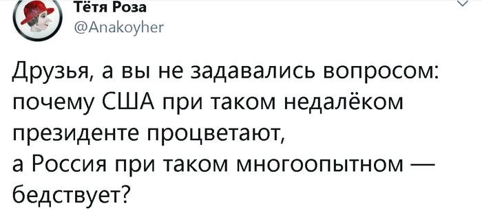 Задайся вообще вопросом:почему США при таком недалёком президенте процветают,а Россия при таком многоопытном — бедствует?