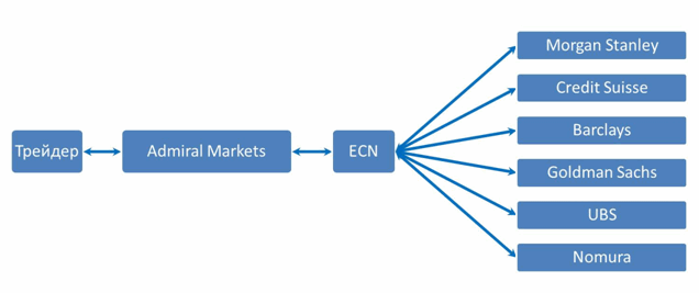 ECN (Electronic Communications Network) в контексте спекулятивной торговли на международном валютном рынке Forex представляет собой сеть, которая соединяет участников рынка, а именно, трейдеров отдающих торговые приказы, и банки. Схематично процесс торговли трейдера на Forex через ECN можно изобразить так: