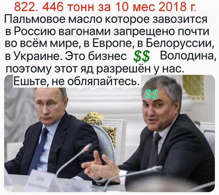В 2018 г. в Россию ввезли 1,06 млн тонн пальмового масла и его фракций на $748,77 млн. В списке основных поставщиков значатся Индонезия, на долю которой приходится 84,1% импорта в Россию, Малайзия (8,2%) и Голландия (4,6%).