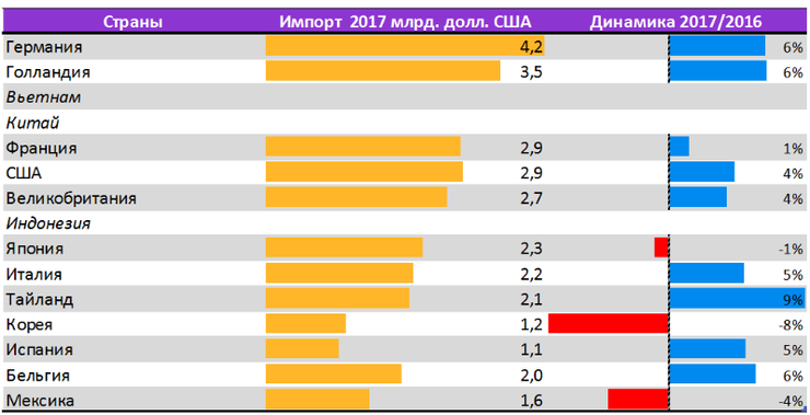 Крупнейшие импортеры – страны с развитой перерабатывающей промышленностью и развитым животноводством – Германия и Голландия, а также страны с высокой численностью населения, активно развивающие собственное животноводство – Вьетнам и Китай.