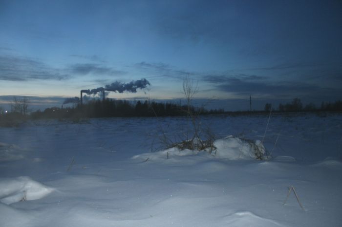 Снова прицепляю лыжи и устремляюсь краем болота. А поезда шумят, а шатурская труба уже всосала в себя бардовое полотнище заката. Тьма сгустилась над Шатурой. Прямо иллюстрация к лозунгу "Мы трахнули маму природу, теперь она трахает нас!". Ветер задувает под куртку. Мокрые ноги не мерзнут, не смеют, не успевают. Вышел к ж\д, но это боковая, мертвая промветка она как раз и ведет к трубе. Все дороги ведут к трубе.
