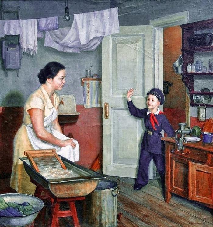 На картине изображен счастливый быт советских людей: есть вода, электричество, судя по счетчику -есть газ, и в коридоре - телефон.
